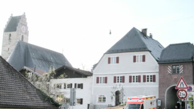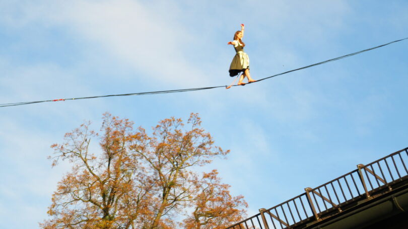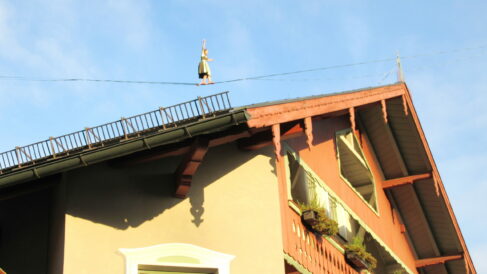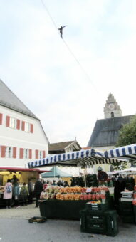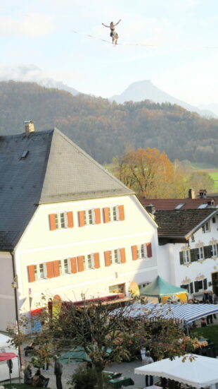 Hoch über den Dächern der Marktgemeinde bot sich ein interressantes Spektakel. Eine Slaklinegruppe, früher sagte man Seiltänzer, bot auf einem, zwischen dem Kirchturm der Pfarrkirche und der Terrasse von Schloß Neubeuern gespannt Seil ihre Darbietungen. Staunend wurde diese Leistung beobachtet und mit viel Applaus bedacht.