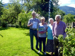 Seit zehn Jahren verbringen Ursula und Konrad Waldsachs aus Bamberg ihre Ferien auf dem Samerberg. Als Domizil haben sie sich das Ferienhaus von Liesl Ruhsamer aus Wenk ausgesucht. Ausgedehnte Wanderungen gehören beim Ehepaar Waldsachs zu den Lieblings-Aktivitäten während der Samerberger Urlaubszeit. Zum Jubiläum bedankte sich das Ehepaar Ruhsamer (re.) bei den Gästen mit einem kleinen Empfang im Garten, der einen schönen Ausblick auf die Hochries bietet.