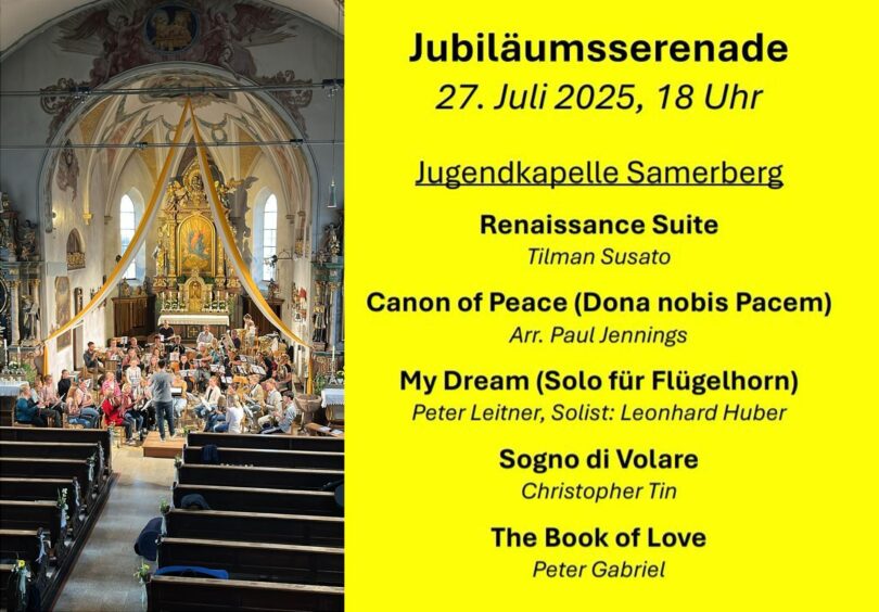 Zur Aufführung kommen Bläser-Werke durch die Jugendblaskapelle Samerberg und durch die Musikkapelle Samerberg.