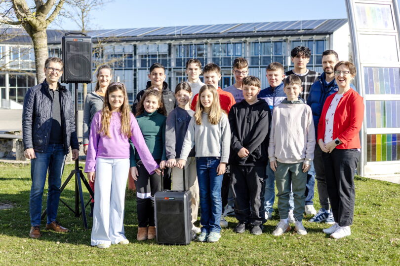 Bericht und Foto: Förderverein der Justus-von-Liebig-Schulen e. V. Heufeld (v. li.); Marco Schmidt (Marketing RCS Audio Systeme), Karin Scherzer (Lehrerin) Schülerinnen und Schüler der Mittelschule, Andreas Stempfhuber (Lehrer und Mitwirkender im Videofilm), Arabella Quiram (Rektorin)