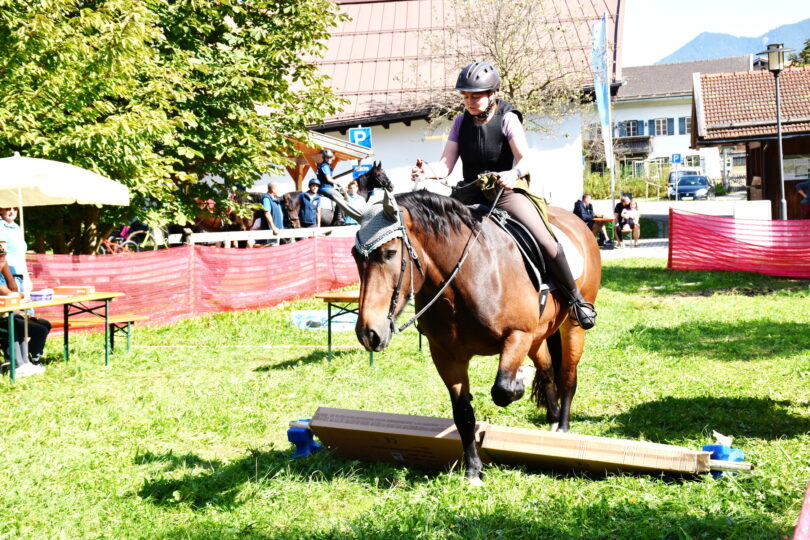 Die Aufgaben, die dann beim Spaßparcours am Dorfplatz auf die Reiter warteten, hatten es diesmal ordentlich in sich. Es wurden Punkte für die einzelnen Stationen vergeben, die sich nach den Schwierigkeitsgraden gliederten, ob komplett ausgeführt, geritten oder das Pferd geführt wurde. Das beherrschende Thema waren -ganz umweltfreundlich- Pappkartons. An der ersten Station musste der Reiter sein Pferd so dirigieren, dass er ein Karton an einem Tisch aufnehmen konnte und ein Stück weiter auf dem nächsten Tisch wieder ablegte. Als nächstes musste das Pferd über ein Karton-Cavaletti –möglichst ohne Anstoßen- reiten, was die Festigkeit der Karton schon arg auf die Probe stellte. Dann warteten eine Kartongasse durch die Pferd und Reiter hindurchritten und danach ein Kartonslalom, der durchritten wurde. Bei der vorletzten Station standen drei Kartons auf einem Tisch, die wieder vom Reiter aufgenommen und in ein Planschbecken geworfen werden mussten. Das alles auf dem Pferd sitzend erwies sich als ziemlich knifflig. Die letzte Station stieß bei fast allen Pferden auf so gar kein Interesse. Es wartete ein Karton an dessen Grund für jedes Pferd ein frischer Teller mit ein wenig Apfelmus (natürlich ohne Zucker) stand. Nun sollte das Pferd seinen Kopf tief in den Karton senken, um das Mus aufzunehmen. Die große Mehrzahl nahm lieber das frische Gras rund um den Karton ins Maul, da halfen auch alle Tricks der Reiter nichts. Mit dem Anschlagen der Glocke an einem Galgen, war der Parcours dann geschafft. Es war sehr interessant, die verschiedenen Charaktere von Pferd und Reiter beim Bewältigen der Aufgaben zu beobachten. Einige Pferde wollten unbedingt nur mit ihrem Kumpel zusammen die Aufgaben lösen und andere lieber von ihrem Reiter geführt werden. Die Besucher aus Nah und Fern und in allen Altersgruppen konnten sich an verschiedenen Schmankerln vom Grill oder frisch gebackenem Kuchen erfreuen und die Jüngsten tobten auf der großen Hüpfburg.
