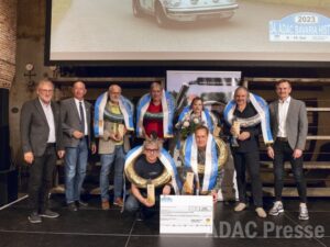 So sehen Sieger aus: Gerd Lambert und Michael Loerke sicherten sich zum dritten Mal in Folge den Gesamtsieg der ADAC Bavaria Historic. Zweite wurden Stefano und Susanna Ginesi. Auf dem dritten Platz landeten Andreas Zunehmer und Rolf Pellini. ADAC Sportleiter Fritz Schadeck (links) und Fahrtleiter Fritz Riedl (rechts) überreichten den glücklichenGewinnern ihre Pokale im Beisein von Martin Zoßeder (2. von links), Einrichtungsleiter der Caritas Wendelstein Werkstätten, in denen die Pokale gefertigt wurden.