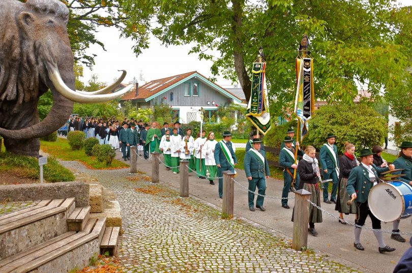 Bei kühlen Temperaturen im vormittäglichen Traunnebel feierten die beiden Trachtenvereine Siegsdorf und Heutau am Sonntag nach Erntedank ihren Jahrtag mit einem festlichen Gottesdienst im Siegsdorfer Kurpark und einem Totengedenken vor dem Kriegerdenkmal. Angeführt von der Musikkapelle Vogling-Siegsdorf marschierten gut 150 Trachtlerinnen und Trachtler, Dirndl und Buam mit den beiden Vereinsfahnen vom Rathausplatz zum Kurpark an der Traun, wo im Pavillon ein festlicher Altar vorbereitet war.