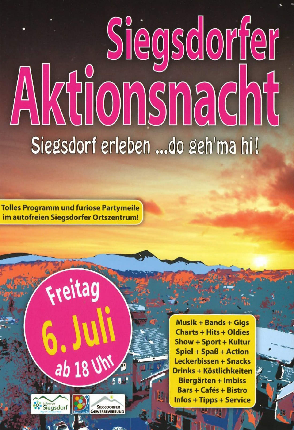 Siegsdorf erleben …do geh’ ma hi! Kommen, schauen, mitmachen, erleben und genießen Sie das große Siegsdorfer Sommernachtsfest: 60 x Unterhaltung, Gaudi und Köstlichkeiten für Kehle, Gaumen, Aug’ und Ohr! Die Siegsdorfer Aktionsnacht steht auch heuer wieder für jede Menge Live-Musik, Show, Tanz, Sport, Spiel, Spaß, Aktion, Bars, Biergärten, Cafés, Essen, Schlemmen, Service, Angebote und Infos. Stellen Sie Ihr ganz individuelles Unterhaltungsprogramm zusammen oder lassen Sie sich herrlich planlos durch die tolle Siegsdorfer Party- und Flaniermeile treiben. Bummeln Sie mit der Familie im autofreien Ortszentrum, treffen Sie sich mit Freunden im Café, lernen Sie nette Menschen im Biergarten oder an der Bar kennen, feiern Sie ausgelassen beim Abrocken zu cooler Open Air Live-Musik, bestaunen Sie die vielen Auf- und Vorführungen und nutzen Sie die mannigfaltigen, interessanten und sehenswerten Aktionen und Angebote unserer heimischen Akteure, Künstler und Anbieter. Vier Arena-Bühnen mit atemberaubender Live-Action-Show nonstop An vier Standpunkten sehen Sie heuer wieder ein durchgehendes Programm verschiedener Vereine und Gruppierungen. Tanz sowie sportliche und musikalische Kurz-Auftritte in rasantem und mitreißendem Wechselspiel sorgen am Kirchplatz, am Rathausplatz und an der Kreuzung Haupt- und Ruhpoldinger Straße für kurzweilige Unterhaltung nonstop. Das besondere Dorffest mit tollem Programm und furioser Partymeile im autofreien Siegsdorfer Ortszentrum – Eintritt frei! Tourist-Info und Siegsdorfer Gewerbeverbund laden also wieder ein zu einem ereignis- und erlebnisreichen Abend mit Bekanntem und Bewährtem sowie immer wieder mit völlig überraschenden und teils erstaunlichen Akteuren, Talenten und Angeboten. Schalten Sie in der Siegsdorfer Aktionsnacht Ihr i- oder Smartphone aus und legen Sie eine Facebook-, WhatsApp- und Instagram-Pause ein, denn in Siegsdorf tobt in dieser langen Nacht das wahre Leben. Dabei sollten Sie sich nichts entgehen lassen, nichts versäumen und nichts unversucht lassen. Probieren, beobachten und genießen Sie ganz ungezwungen alles und mit allen Sinnen. Bei dieser ausgelassenen Stimmung, inmitten Tausender Gleichgesinnter, fällt das besonders leicht und man gehört automatisch überall dazu. Kurz: Verbringen Sie unbeschwerte Stunden bei uns in Siegsdorf – wir freuen uns auf Sie!