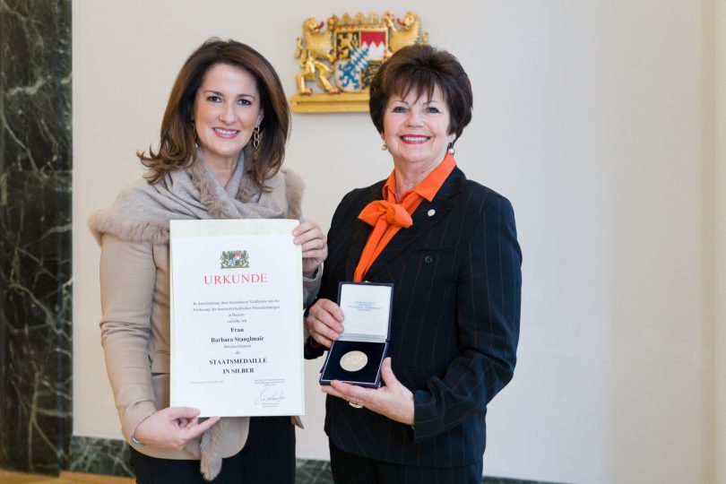 Die Ministerin würdigte damit die besonderen Verdienste der 69-jährigen Hauswirtschaftsmeisterin um die bayerische Land- und Hauswirtschaft sowie um die Menschen im ländlichen Raum. „Als Unternehmerin und Leistungsträgerin haben Sie neue Wege aufgezeigt, wie man mit einem professionellen hauswirtschaftlichen Angebot ein zusätzliches Einkommen für landwirtschaftliche Betriebe sichern kann“, sagte die Ministerin. Damit habe sie einen wichtigen Beitrag für die Schaffung von qualifizierten, wohnortnahen Arbeitsplätzen für Frauen im ländlichen Raum geleistet. Mit ihrem großen Engagement als Unternehmerin und auf Verbandsebene habe Barbara Stanglmair zudem den Bekanntheitsgrad der professionellen Hauswirtschaft deutlich erhöht und eine positive Imagesteigerung des Berufs bewirkt.