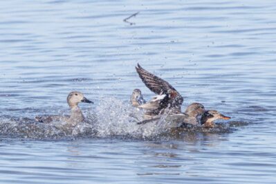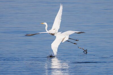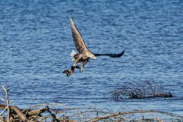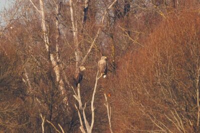 Große Begeisterung nicht nur bei den Fotografen. Seit gestern hat der schon viele Jahre einsam am Chiemsee lebende Seeadler offensichtlich einen Partner/Partnerin gefunden. Gemeinsam genossen sie nach einer frostigen Nacht die ersten Sonnenstrahlen. Ein Mäusebussard hatte vergeblich versucht, eine tote Stockente aus dem Wasser zu heben. Die beiden Adler hatten dies offensichtlich beobachtet, kreisten kurz über der Beute, der „einheimische“ Adler erbeutete die schon ziemlich zerflederte tote Ente und gemeinsam flogen sie zurück ins Achendelta. Ein Sperberweibchen sorgte kurz für Aufregung unter den zahlreichen Wasservögeln. Spießenten, Krickenten und Reiherenten landeten schon kurz darauf wieder, wo sie bei extrem niedrigem Wasserstand im See gemeinsam mit über hundert Graugänsen schon mitten in der Bucht nach Nahrung gründeln konnten. Ein Rotkehlchen sonnte sich im ersten Morgenlicht und die Schnatterenten balzten aufgeregt während etwa 40 Brachvögel in den nun freiliegenden Schlickflächen nach Nahrung suchten und Silberreiher offensichtlich um die besten Fanggründen stritten.