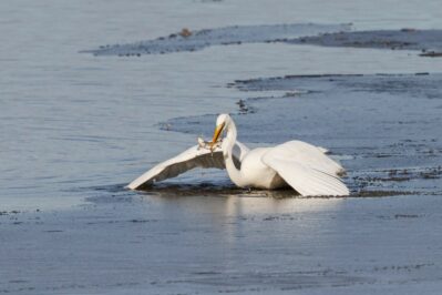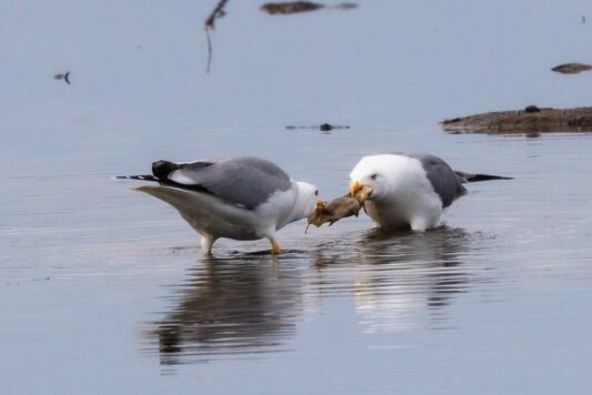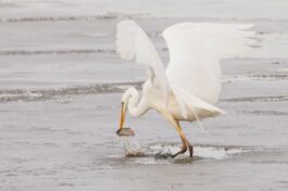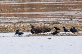 Bei fast schon frühlingshaften Temperaturen machte ich mich auf den Weg zur Hirschauer Bucht, die ich mit dem Rad auf der zwischenzeitlich wieder freigegeben Zufahrt erreichte. Das Eis in der Bucht war schon weitgehend getaut. Unter der verbliebenen Eisfläche suchten offensichtlich zahlreiche Weißfische noch Schutz vor hungrigen Fischjägern. Doch Silber- und Graureiher nutzen zwischenzeitlich aufgetaute kleine Eislöcher, um erfolgreich die nun ungeschützten Fische, überwiegend Aitel, zu jagen. Gänsesäger tauchten jetzt ebenfalls unter das Eis, während Rostgänse und Spießenten bei extrem niedrigem Wasserstand schon in der Buchtmitte gründelnd den Seeboden erreichten. Mittelmeermöwen stritten um eine vom schmelzenden Eis freigegebenen tote Schleie, zwei Seeadler fraßen gemeinsam abwechselnd ebenfalls an einem Kadaver am östlichen Seeufer. Auch Kormorane entdecken den Eisrand als lohnendes Jagdrevier. Plötzlich einsetzender Sturm mit Regenschauern beendete meinen Ausflug an den Chiemsee.