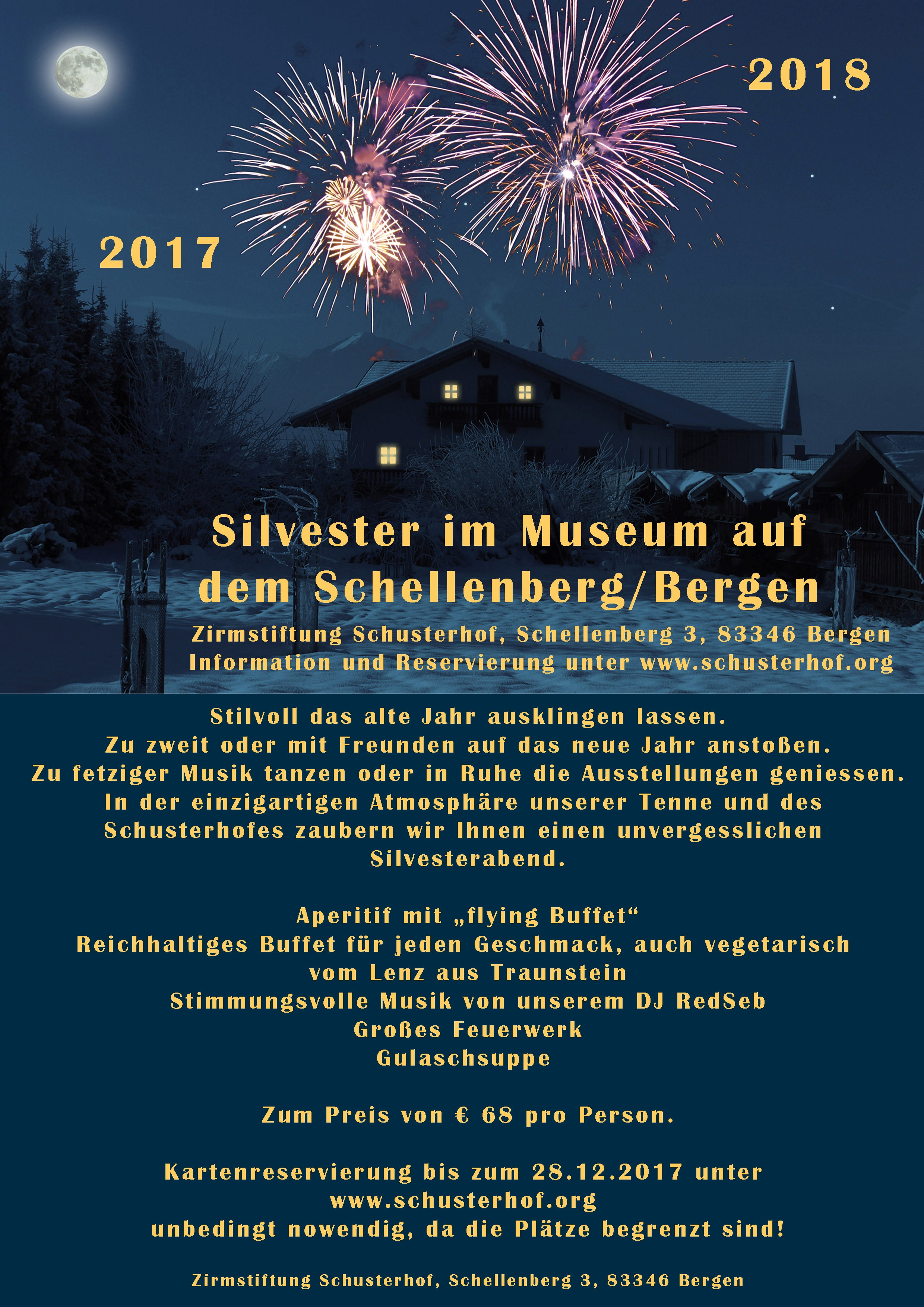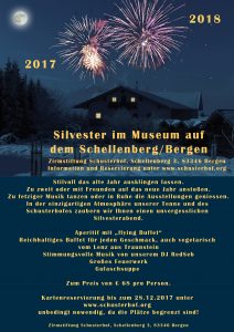 Der Schusterhof veranstaltet dieses Silvester im Museum auf dem Schellenberg in Bergen einen stilvollen Jahresausklang. Dazu gibt es unter anderem stimmungsvolle Musik vom hauseigenen DJ RedSeb, ein großes Feuerwerk und ein reichhaltiges Buffet vom Lenz aus Traunstein. Darüber hinaus ist es möglich, in Ruhe die Ausstellungen zu besichtigen.