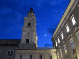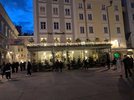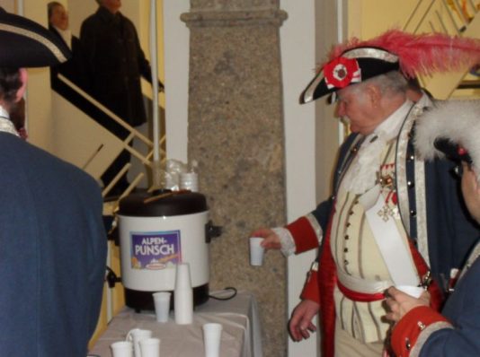 Dann schauen wir kurz ins Rathaus, wo Punsch ausgeschenkt wird, nicht nur für die Bürgergarde – jeder kann sich hier einen Becher einschenken lassen. Anschliessend gehts durch die  Getreidegasse, dem Herzen der Salzburger Altstadt, über den Alten Markt  mit seinen Bürgerhäusern – darunter dem kleinsten Altstadthaus von Salzburg – und dem Café Tomaselli zum Residenzplatz, wo auf einer Bühne DJs und Live-Bands auftreten und zum Feiern einladen.