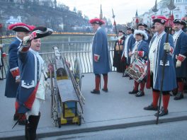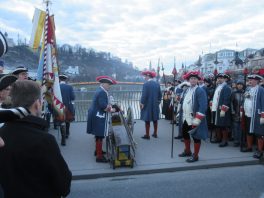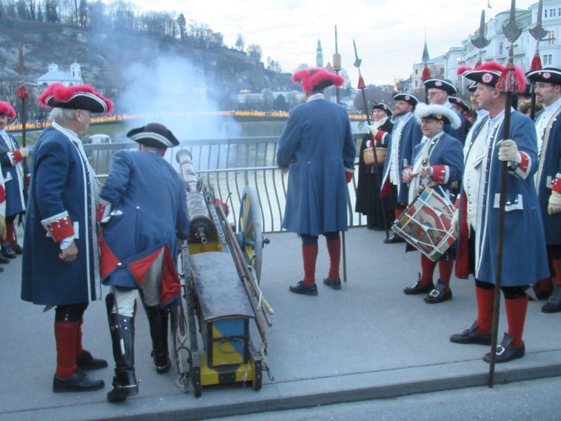 Wir starten unseren traditionellen Silvesterbummel wieder auf der Staatsbrücke, wo wir um 16 Uhr das Neujahrsschießen der Festungsprangerstutzenschützen von der Festung Hohensalzburg beobachten können. Dort marschiert dann kurz darauf die Bürgergarde auf und begrüsst nach den Neujahrswünschen des Bürgermeisters das neue Jahr mit Salutschüssen.