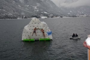 Die Teilnehmer müssen eine Schwimmstrecke von 50 m überwinden und den Eisberg im See erklimmen.