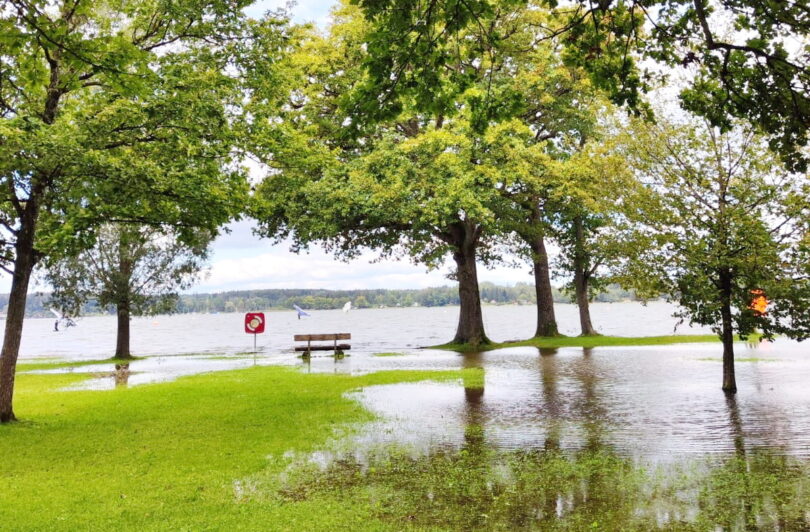 Wasser überall – so auch am Badeplatz in Pietzing und am Simssee. Trotz der unwittrigen Verhältnisse wagen sich Windsurfer noch auf das Wasser, was auf Unverständnis der Betrachter stößt.