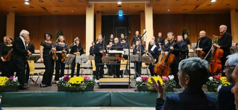 Ein weiterer Höhepunkt des Abends war nach der Pause die fulminante Aufführung von Antonin Dvoraks achter Sinfonie (in manchen Konzertführern auch als 4. Sinfonie bezeichnet) in G-Dur, opus 88, die der aus dem Böhmerwald stammende Komponist im Jahr 1889 geschrieben hatte. Das hoch motivierte, technisch versierte und bestens aufeinander eingespielte Orchester spielte dieses in Episoden komponierte Werk brillant in voller sinfonischer Besetzung mit Streich-, Holz- und Blechblasinstrumenten und rund 40 Mitwirkenden aus der Region. Beim dritten Satz, dem Allegretto, ist ein böhmischer Tanz in G-Moll verwoben, in den die Flöten fröhlich einbrechen. Auch alle anderen Blas- und Streichinstrumente kommen im 4. Satz, dem Allegro ma non troppo, in einzelnen Teilen beinahe solistisch zum Ausdruck, eingeleitet von der triumphalen Trompetenfanfare zu Anfang.