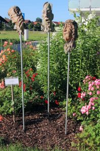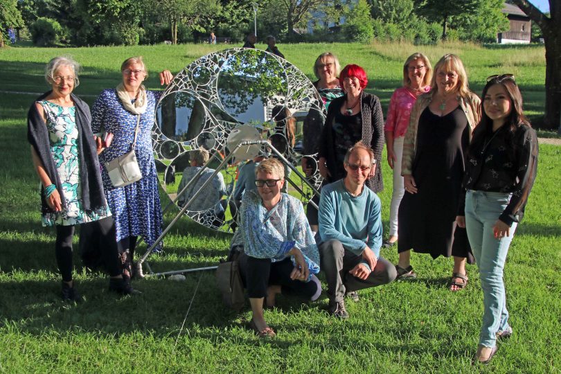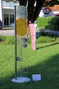 Am vergangenen Dienstag eröffnete Bürgermeisterin Irene Biebl-Daiber im Beisein einer großen interessierten Besucherschar die mittlerweile vierte Skulpturenausstellung des Bernauer KunstKreises im Kurpark, in unmittelbarer Nähe des Rathauses. Nach vielen Monaten des Verzichts konnte man richtig spüren, wie die Anwesenden den Abend mit Kultur genossen. Einen wunderschönen äußeren Rahmen dafür lieferte der üppig blühende und in unterschiedlichen Grüntönen leuchtende Kurgarten, der beim Sonnenuntergang noch einmal andere Farben annahm. Nach einer kurzen Begrüßung durch die Bürgermeisterin stellten die KunstKreis-Vorsitzende Dr. Corinna Brandl und ihre Mitstreiterin Dorothee Tielemann die ausstellenden Künsterinnen und Künstler samt Werken vor. Neben den Mitgliedern des KunstKreises (Anne Aasmann, Olga Brückmann, Corinna Brandl, Yaninne Cansaya, Steffie Dirscherl, Dorothee Tielemann, Christl Wittmann und Maria Sigl) konnte auch eine Reihe an befreundeten KünstlerInnen (Bettina Schranner, Bettina Graber-Reckziegel, Carsten Reckziegel, Moni Stein, Marah Strohmeyer-Haider und Fernando Gabel) für diese Ausstellung gewonnen werden. Im Zentrum steht in diesem Jahr „Das Rad des Lebens“, ein Spiegel-Mosaik von Dorothee Tielemann. Daneben findet man abstrakte Gebilde, wie den „Mut zum Chaos“ von Dr. Corinna Brandl, bei dem in einem Bilderrahmen verschiedene Fundstücke des täglichen Lebens platziert wurden. Noch viele weitere Figuren und Kunstwerke aus Holz, Glas, Beton, Onyx, Kalkstein und Bronze warten darauf, von Suchenden entdeckt zu werden.