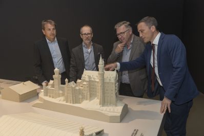 Neuschwanstein im Blick: (v.l.n.r.) Jörg Kaltmaier von der Firma Voxeljet aus Friedberg bei Augsburg, Architekturdesigner Robert Reiter, Dr. Rainhard Rieperting, stellvertretender Direktor des Hauses der Bayerischen Geschichte und Dr. Andreas Kuhn, Leiter Museumspädagogik im Haus der Bayerischen Geschichte, begutachten das 3D-Modell des Schlosses Neuschwanstein. Verwendung nur im Rahmen der Berichterstattung zum Museum der Bayerischen Geschichte.