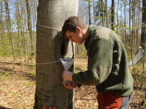 Simon Thorn beim Leeren einer Insektenfalle im Nationalpark Bayerischer Wald. Dadurch kann man Rückschlüsse auf die Artenvielfalt des jeweiligen Gebietes ziehen. (Foto: Simon Thorn /Nationalpark Bayerischer Wald)