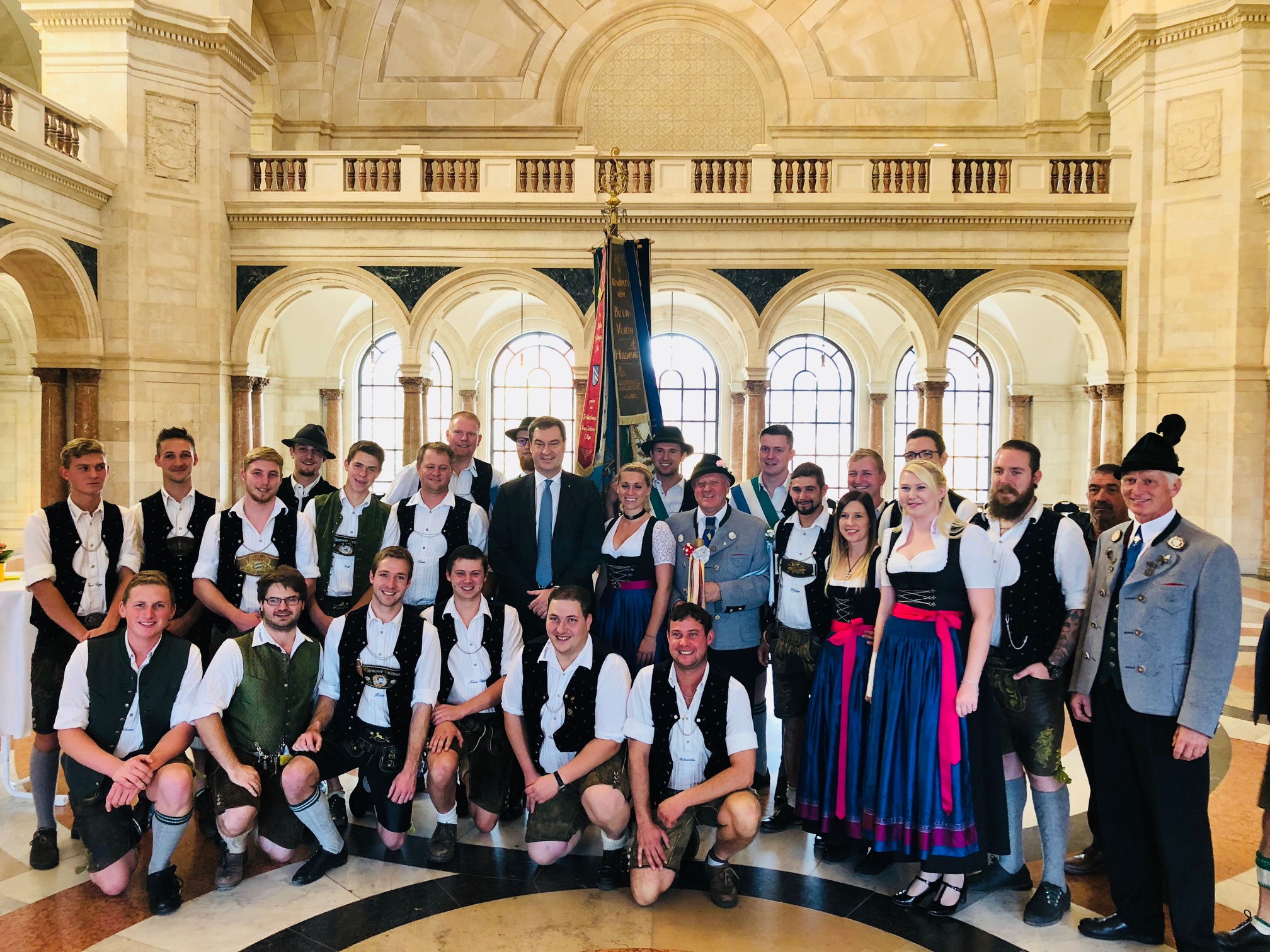 Gruppenbild des Katholischen Burschenvereins mit Ministerpräsident Dr. Markus Söder und 2. Bürgermeister der Gemeinde Eggstätt, Christian Glas