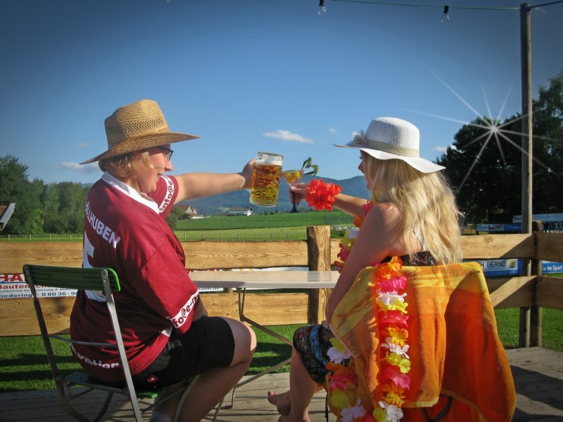 Bildunterschrift: „SVS goes Karibik“ – im gemütlichen Zeltbiergarten mit Bergblick