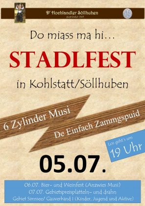 Am kommenden Wochenende ist ziemlich was los im Kohlstatter Stadl. Los geht’s am Freitag, 5. Juli, um 19 Uhr mit dem Stadlfest. Die beiden jungen Musikgruppen „De einfach Zammgspuid“ und die „6 Zylinder Musi“ werden für einen unterhaltsamen Abend mit ihren abwechslungsreichen Musikstücken sorgen. Die Kindergruppe führt ihre Tänze und Plattler auf.