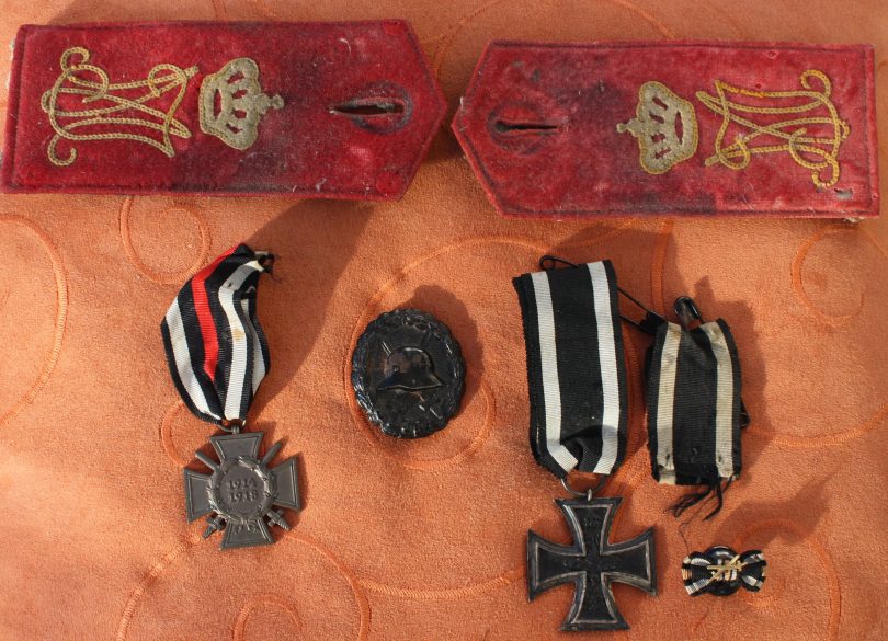 Oben die Schulterklappen des Mantels, die im Feld nicht mehr getragen wurden. Die Schulterklappen gehörten zum kgl. Bayerischen Infanterieregiment Nr. 1 König und wiesen mit den Initialen M und J auf den Max Josefs Orden hin, mit dem das Regiment ausgezeichnet war. „Mädchenjäger“ taufte der Volksmund diese Initialen des stolzen Regiments um und auch auf diese Bezeichnung waren die Einser sehr stolz.