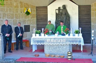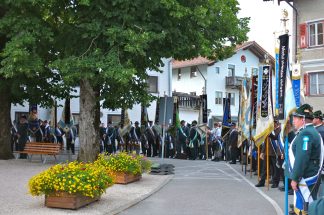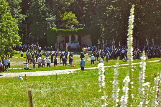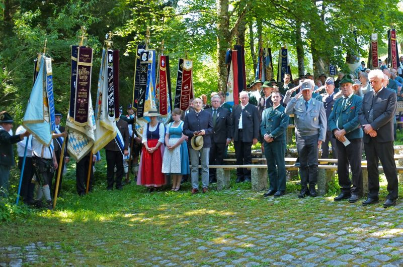 Der Guardian des Klosters, Bruder Franz Maria, freute sich über die Wallfahrt als „unverzichtbaren Termin in bedrohlichen Zeiten“ und über die rund 40 Vereinsfahnen die sich um den grün umrankten Freialtar unterhalb des Klosters gruppierten. Er war sich mit Pfarrer Vasile Dior einig: „Wenn wir auf die Fragen der Zeit keine Antworten haben, kann uns Jesus der Friedensfürst Hoffnung, Mut und Zuversicht schenken“. Zu den Klängen der Musikkapelle Bergen unter der Leitung von Robert Zieher jun. zelebrierten die beiden Geistlichen einen festlichen Gottesdienst im Zeichen der Erinnerung und Mahnung. Gauvorstand Michael Bernauer erinnerte dabei besonders an die Opfer der aktuellen Kriegshandlungen in der Ukraine und mahnte: „Frieden und Demokratie sind keine Selbstverständlichkeiten, pflegen wir im täglichen Leben Werte wie Friedfertigkeit, Toleranz und Nächstenliebe“. Dem konnte sich auch Sepp Kohnhäuser, der stellvertretende Landrat des Landkreises Traunstein anschließen. Er lobte die KSK-Vereine für ihre immerwährende Arbeit als „Mahner für Frieden und Freiheit“. Dietmar Friedrich, der erste Vorstand der KSK Bergen nannte die Wallfahrt ein Zeichen von „Miteinander statt Gegeneinander“, dankte allen Helfern, die sich bei der Organisation der Wallfahrt eingebracht hatten und freute sich über die Unterstützung der Ortsvereine und der Gemeinde Bergen. Gauvorstand Bernauer hob besonders die Mitwirkung der Polizei, der Rettungsdienste und der Ehrengäste hervor, bevor Pater Dior den Schlusssegen spendete und die Fahnen sich, begleitet von der Musikkapelle Bergen, zum ehrenden Gedenken, zur Erinnerung und Mahnung senkten. Franz Krammer