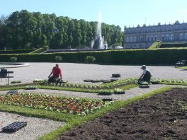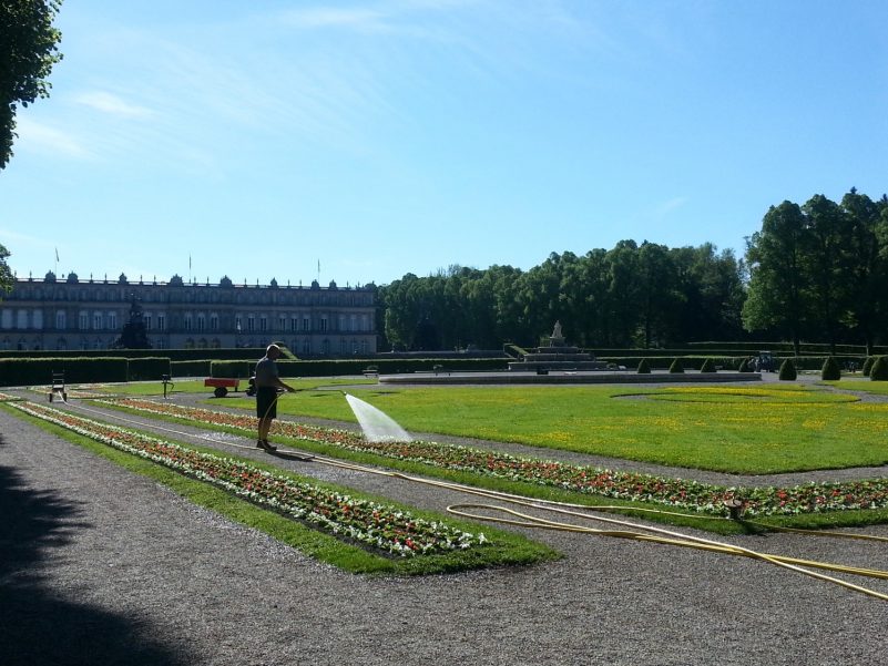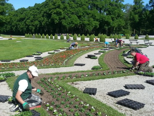 Nach den regnerischen Wochen im April und Anfang Mai und den dieses Jahr etwas früher gekommenen, sehr kalten Eisheiligen, haben die Gärtner von der Herreninsel die ersten wirklich warmen Tage genutzt und mit der Sommerbepflanzung des Schlossparks begonnen. Dabei mussten leider zunächst alle immer noch schön blühenden Tag-und Nacht-Schatten entfernt und dann durch widerstandsfähige Eis-Begonien, die seit Anfang des Jahres im eigenen Gewächshaus herangezogen wurden, ersetzt werden.