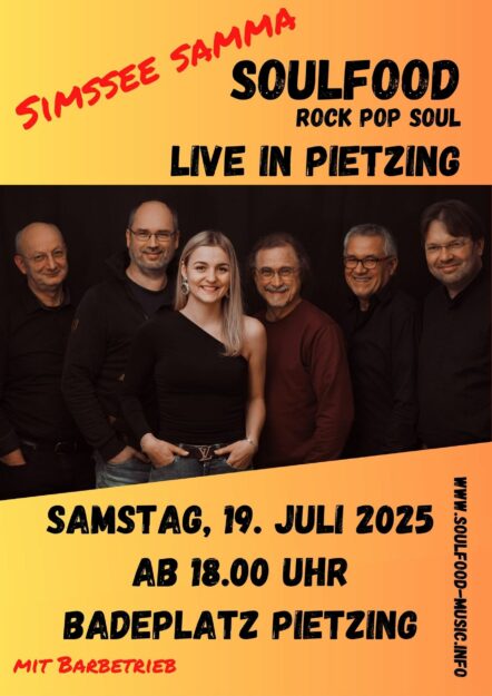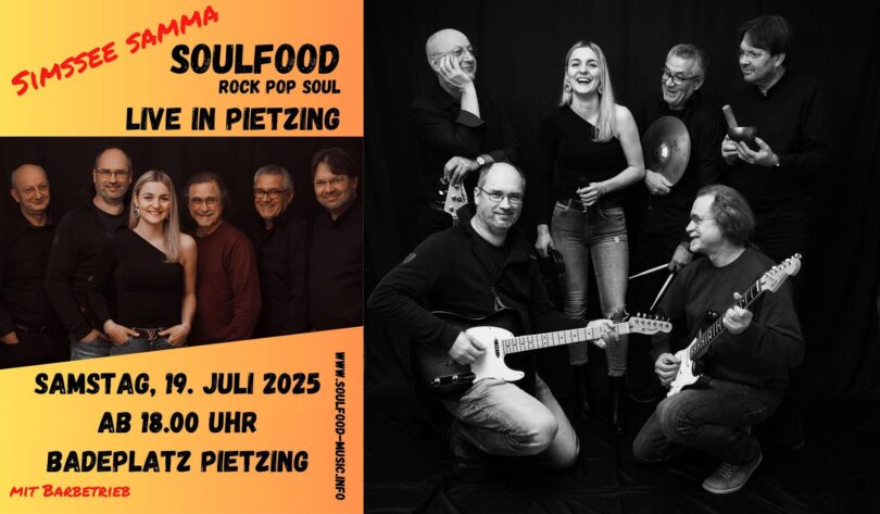 Pietzing: Am Samstag, 19. Juli, heißt es ab 18 Uhr wieder „Simssee Samma“ – Livemusik, Sommerstimmung und gute Laune am Seeufer. Die Band Soulfood sorgt mit Rock- und Soulklassikern für den richtigen Soundtrack zum Sonnenuntergang. Für das leibliche Wohl ist gesorgt: Getränke und Brotzeiten gibt’s vom Kiosk, die katholische Landjugend übernimmt den Barbetrieb. Der Eintritt ist frei – einfach vorbeikommen und genießen!