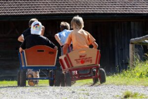 Der Lausbubentag endet mit dem lustigen Leiterwagenrennen. © Foto: Bezirk Oberbayern, Archiv BHM Amerang, G. Nixdorf