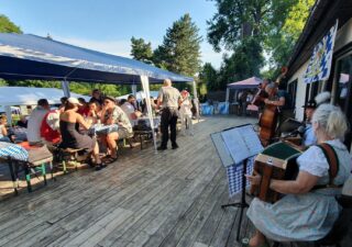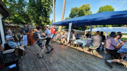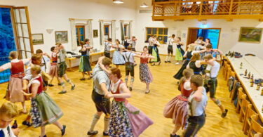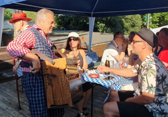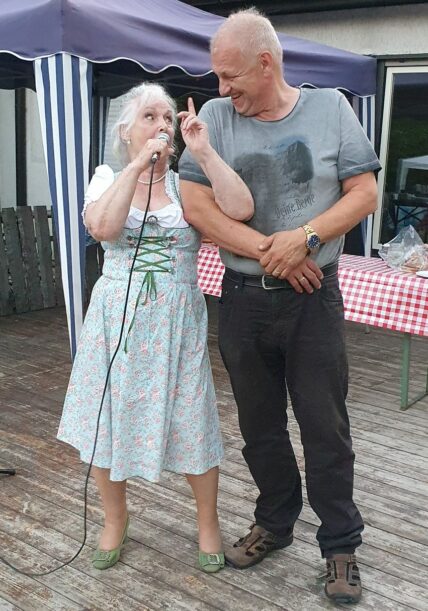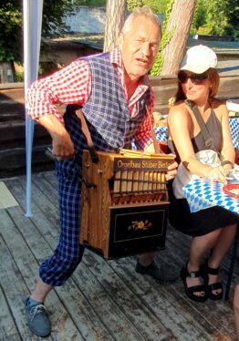 Dazwischen dann die Berliner Gassenhauer vom Eckensteher Nante auf seiner Drehorgel. Tatkräftige Gäste an der Drehorgel wurden sogar mit einem Drehorgeldiplom ausgezeichnet. Ein weiteres Highlight waren die Schuhplattlereinlagen der Gäste von den Berliner Querplattlern. Höhepunkt war der gemeinsame Plattler, die Amboss-Polka, zusammen mit Plattlern der Trachtentanzgruppe des Vereins der Bayerns in Berlin. In bayerisch-österreichischer Mundart gab es dann noch Gesangsstücke vom Rudi und Franz, vom Chor der Österreichisch-Deutschen Gesellschaft e.V. Berlin-Brandenburg, unterstützt von Sängern der „Wannseemöwen“ aus Berlin.
