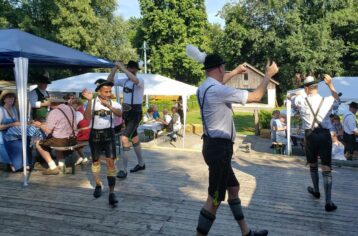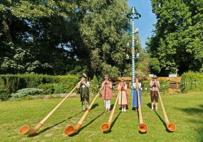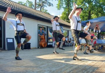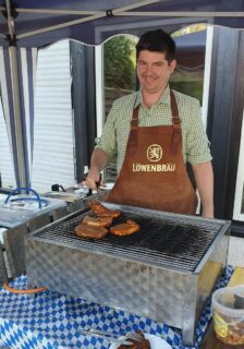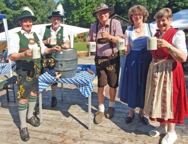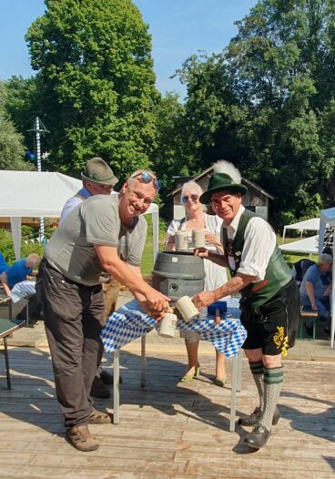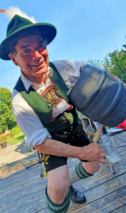 Bei hochsommerlichen Temperaturen und unter weiß-blauem Himmel wurde das Fest auf dem Bayernplatz mit alpinen Klängen von „Alphorn-Bavaria-Berlin“ eröffnet. Danach hieß es „O’zapft is“. Martin Stock, der das Fass mit fränkischem Bier als Geburtstagslage spendierte, brachte den edlen Gestensaft mit einem Schlag zum Fließen. Martin ist auch Initiator des Berliner Frankenstammtisches, mit dem er die fränkischen Regierungsbezirke von Bayern in Berlin vertritt. Neben den Franken war auch Franz Schuhbauer mit seinem Bayernstammtisch Berlin vertreten, dessen Stammtischbrüder mehr aus Oberbayern, Niederbayern und der Oberpfalz stammen. Musikalisch wurde der Schwäbische Regierungsbezirk repräsentiert, von Felix Lämmel mit seiner Jodel-Moni. Beide gehören auch zu den Steirer-Musikanten des Vereins. Zusammen mit Musikern vom Berliner Musikantenstammtisch wurde das Sommerfest stimmungsvoll umrahmt.