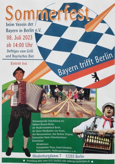 Das traditionelle Sommerfest des Vereins Bayern in Berlin fand dieses Jahr unter dem Motto „Bayern trifft Berlin“ statt. Stargast war das Berliner Original „Der Eckensteher Nante“, der mit Witz und Charm sein Berlin präsentierte. Eingebettet in die bayerischen Traditionen des Vereins war das Fest quasi eine „multikulturelle“ Brauchtumsveranstaltung, welche die freundschaftliche Verbundenheit der Berliner zu den Bayern zum Ausdruck brachte.