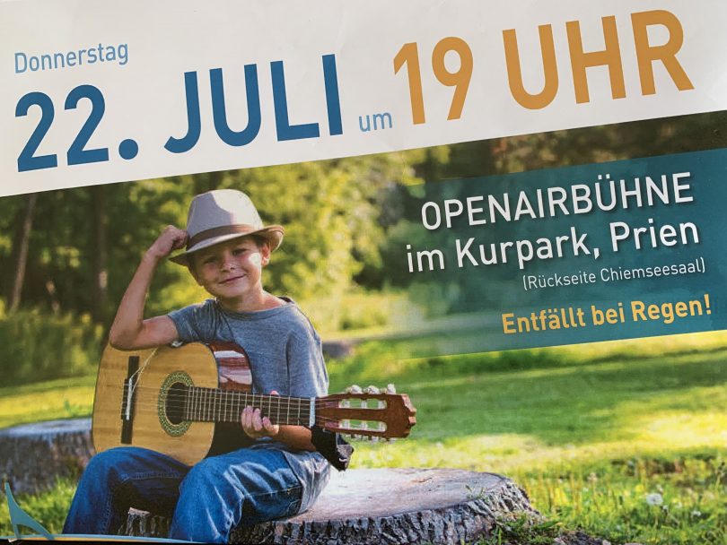 Am Donnerstag, 22. Juli gibt die Priener Musikschule auf der Open-Air-Bühne im Kleinen Kurgarten (beim Haus des Gastes) ein Sommerkonzert. Es musizieren ab 19 Uhr Solisten und kleine Ensembles der Musikschule, der Eintritt ist frei. Die Veranstaltung findet nur bei guter Witterung statt.