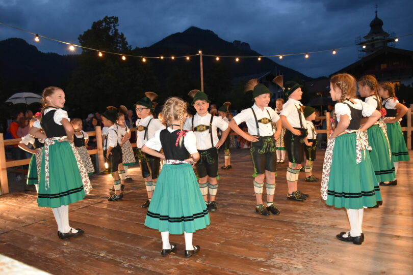 Der Trachtenverein d’Gamsgebirgler veranstaltete das für dieses Jahr letzte Sommernachtsfest auf dem Dorfplatz. Ringsherum erstrahlten die Berge im Licht des Wetterleuchtens und in der Mitte des Platzes loderten die Flammen des Holzes in den Feuerschalen.
