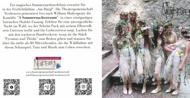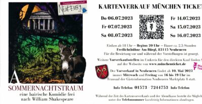 Ein Theaterhöhepunkt in der Region dürfte die Freilichtaufführung im Bürgl von Altenbeuern werden. Die Theatergemeinschaft Neubeuern unter der Leitung von Heinz-Klarei-Baumgartner bringt den “Sommernachtstraum” von Shakespeare als eine bairische Komödie zur Aufführung.