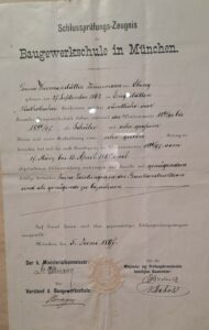 Ein besonderer Schatz in der Ausstellung ist das Original  des Schluss-Prüfungszeugnis der Baugewerkschule in München, dass an Benno Wurmannstätter im Juni 1897 ausgehändigt wurde.