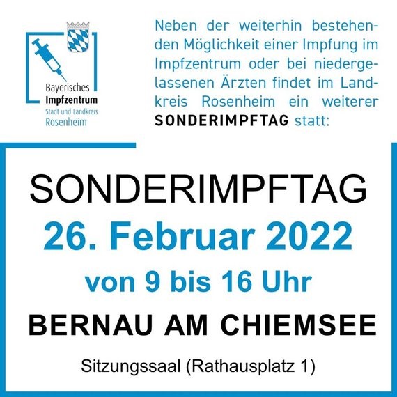 Die Gemeinde Bernau a. Chiemsee informiert: Impfen ohne Impftermin für alle ab 12 Jahren! Am 26.02.2022 von 09:00 Uhr bis 16:00 Uhr ist das Impfteam in der Gemeinde Bernau am Chiemsee (RAthausplatz 1) im Einsatz. Um eine vorherige Registrierung unter www.impfzentren.bayern wird gebeten.