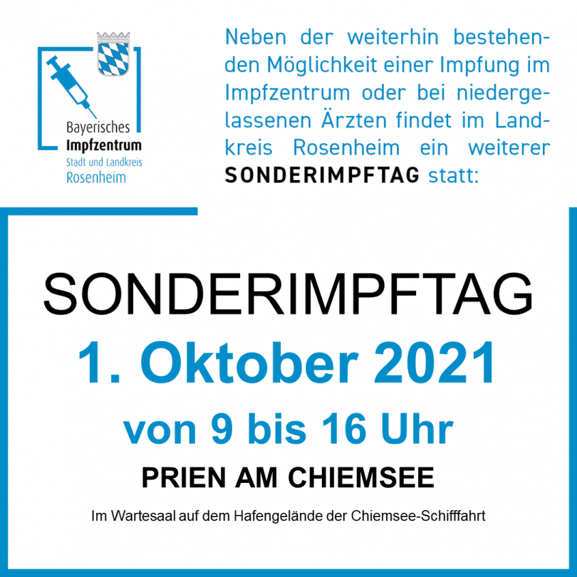 Der Landkreis Rosenheim bietet, neben den weiterhin bestehenden Möglichkeiten einer Impfung im Impfzentrum oder bei niedergelassenen Ärzten, auch die Möglichkeit zur Impfung durch ein mobiles Impfteam. Dieses ist ein weiteres Mal in Prien am Chiemsee am 1. Oktober 2021 von 9 bis 16 Uhr im Wartesaal auf dem Hafengelände der Chiemsee-Schifffahrt im Einsatz.