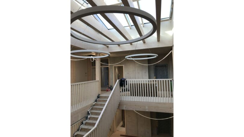 Viel Licht, helles Lärchenholz und eine breite Treppe mit Sitzstufen lassen in der künftigen Aula bereits erahnen, wie die Schule nach der Fertigstellung aussehen wird. Schulleiterin Angelika Held zeigte sich besonders begeistert von den vielen baulichen Details, die den Schulalltag in Zukunft erleichtern werden. Dazu zählen die Aula als zentraler Ort für Versammlungen ebenso wie ein großer Balkon, der den Ganztagesbereich erweitert, sowie an die Klassenräume anschließende Gruppenräume. Das ermöglicht einerseits das Arbeiten in verschiedenen Räumen, andererseits bleiben die Schülerinnen und Schüler weiterhin in der Blickachse der Lehrkräfte. Neben den Besonderheiten des Holzbaus erläuterte Architektin Stefanie Willeke das Konzept eines sogenannten „Low-Tech-Gebäudes“. „Wir haben keine große Lüftungsanlage, sondern dezentrale Geräte, wo diese notwendig sind“, erklärte sie.