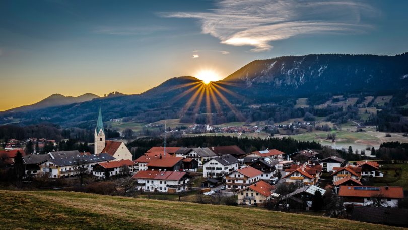 Einen für den Samerberg verheißungsvollen Sonnenaufgang hat der Samerberger Fotograf Rainer Nitzsche mit dieser Aufnahme festgehalten. Das Bild zeigt exakt den Eintritt der Sonne in das Tagesgeschehen über den Chiemgauer Bergen mit den Samerberger Hauptorten Törwang und Grainbach (dahinter).
