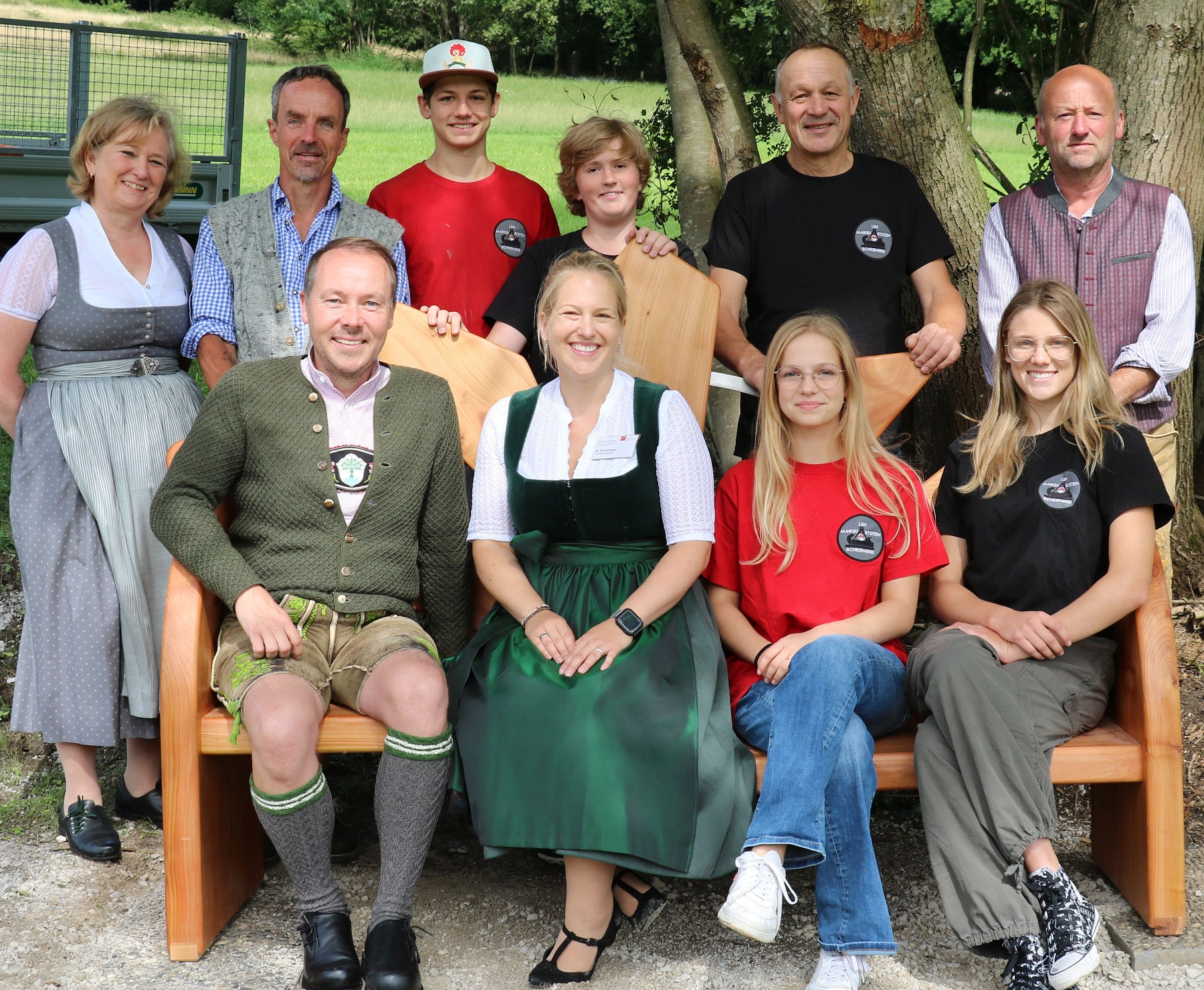 Einweihung der „Sonnenschein Bank“ auf der Aschauer Westseite am „boarischen Entschleunigungsweg“. Von links sitzend Tourismuschef Herbert Reiter – die Leiterin der Klinik Sonnenbichl Nadja Düvelmeyer – Miranda, dahinter stehend von links: Sepp, Maxi, Lili und der Leiter der Schreinerei des Gymnasiums der Landhochschule Marquartstein Miche Huber