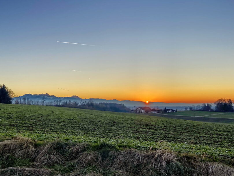 Vom Riederinger Gemeindeteil Neukirchen aus schauend präsentiert sich gerade der Feierabend an winterlichen Sonnentagen von seiner schönsten Seite – wie diese aktuellen Bilder mit Blick über die Gemeinde hinüber zur großen Bergwelt zeigen.