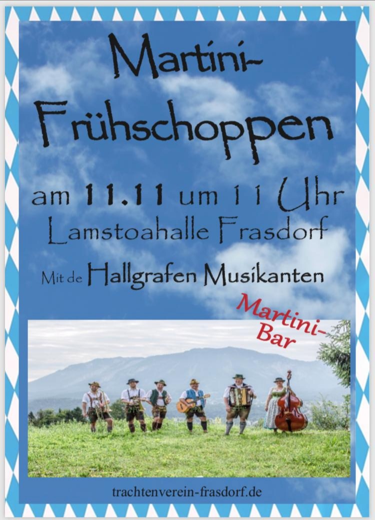 Am Sonntag, den 11. November, findet ab 11 Uhr der alljährliche Martini-Frühschoppen in der Lamstoahalle statt. Die Hallgrafen Musikanten spielen zum Tanz und sorgen für gute Stimmung. An der Bar der Aktiven können ab dem frühen Nachmittag verschiedene Martini-Mischungen genossen werden.