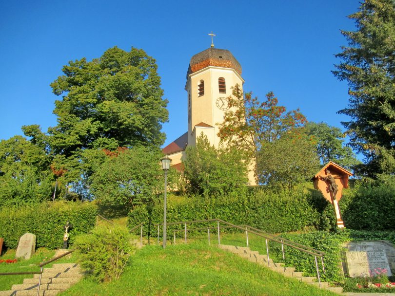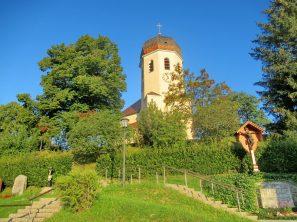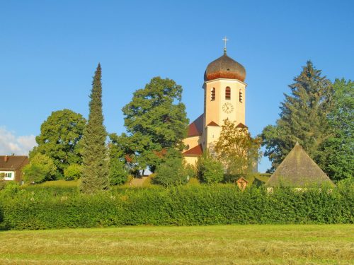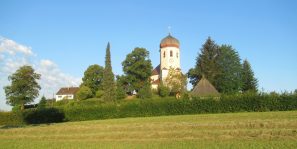 Schon früh am Morgen erstrahlt in diesen Sommertagen die Pfarrkirche “Christkönig” von Wildenwart im Licht der aufgehenden Sonne. Dabei ergibt das Ensemble von Kirche und Gottesacker ein besonders stimmiges und schönes Bild.