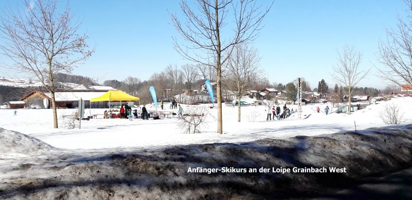 Sonne und Schnee sind derzeit beste Voraussetzungen dafür, dass auf dem Samerberg Ski-Kurse angeboten werden – wie diese aktuelle Sonntags-Aufnahme von Grainbach zeigt, bei der sich auch Anfänger auf die Langlauf-Loipe wagen.