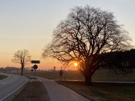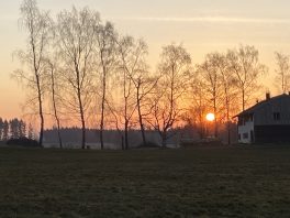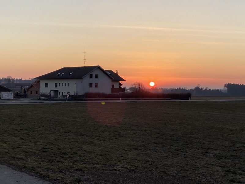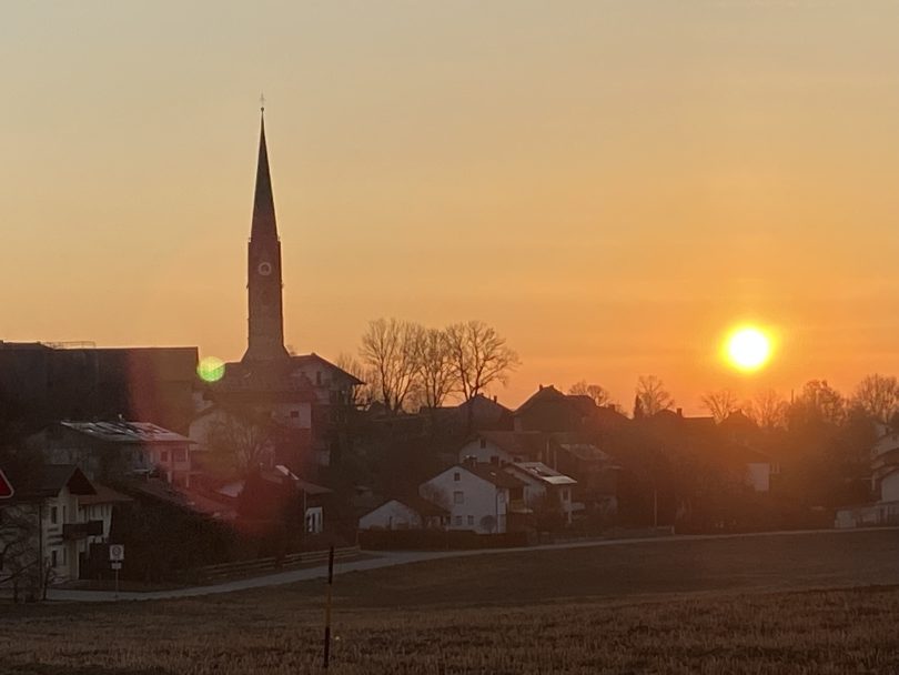 Ein schöner Tag war im Chiemgau am heutigen Sonntag zu erwarten als die Zeit des Sonnenaufgangs war – wie diese Aufnahme auf einer Fahrt vom Chiemsee in Richtung Kienberg zeigen.