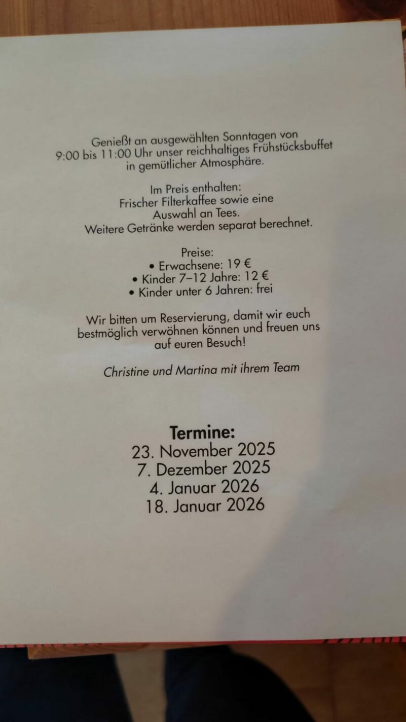 Jeweils von 09-11Uhr gibt es das Frühstückbuffett inkl. frischen Filterkaffee und Tee in entspannter Atmosphäre.