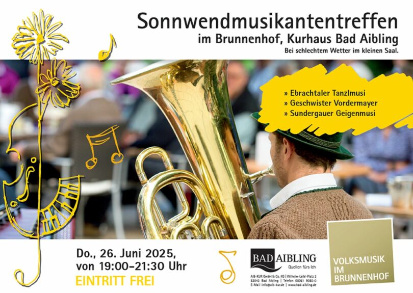 Am Donnerstag, den 26. Juni, von 19 Uhr bis 21:30 Uhr spielen die Ebrachtaler Tanzlmusi, die Geschwister Vordermayer und die Sundergauer Geigenmusi gemeinsam beim Sonnwend-Musikantentreffen im Brunnenhof des Kurhauses Bad Aibling auf. Vor genau 40 Jahren ist die Ebrachtaler Tanzlmusi das erste Mal aufgetreten. Aus Ebersberg stammend, treten sie heute noch nahezu in Originalbesetzung auf. In ihrem Repertoire befinden sich Eigenkompositionen von Peter Reichert und Stücke aus Bayern und Österreich. Ein „Ausgezeichnet“ beim Alpenländischen Volksmusikwettbewerb in Innsbruck, wo sie als Auftaktgruppe die Fernsehübertragung beginnen durften, bleibt für sie alle ein unvergessliches Erlebnis.