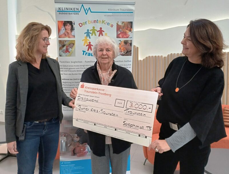 Die Kinderärztin, Neonathologin (Frühgeborenenhilfe) und Diabetologin, Dr. Marina Sindichakis (links) nahm den symbolischen Scheck aus den Händen von SI – Präsidentin Martha Selbertinger (rechts) und Schatzmeisterin Anne Lindenberg stellvertretend entgegen. „Der Bunte Kreis“ nennt sich die sozialmedizinische Nachsorge für schwer und chronisch kranke Kinder sowie Frühgeborene und ihre Familien. Ziel ist es, den Familien den Übergang von einer stationären Versorgung in den Alltag nach Hause zu erleichtern. Viele der Kosten übernehmen die Krankenkassen, aber Fortbildungen, Supervisionen des Personals oder die oft hohe finanzielle Belastung der Familien müssen durch Spendengelder getragen werden.