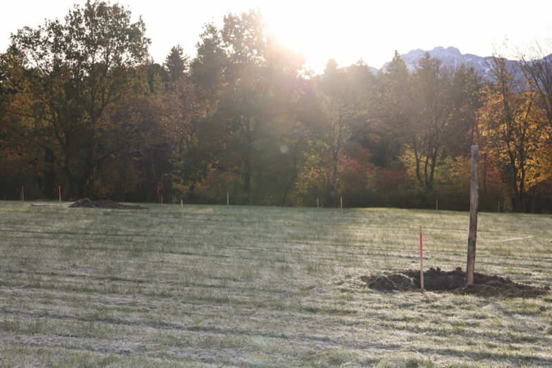 95 vergessene Apfel- und Birnensorten werden auf der Fläche nördlich des Zeltplatzes in Kohlstatt ihre neue Heimat finden. Diese Sorten wurden im Rahmen des Biodiversitätsprojektes „Apfel – Birne – Berge – Alte Obstsorten im oberbayerischen Alpenvorland“ gesucht, genetisch untersucht und nachgezogen, so dass sie nun in diesem Sorten-Erhaltungs-Garten wachsen und gedeihen können. Neben Landrat Otto Lederer und der Projektverantwortlichen Eva Bichler-Öttl waren auch die beiden Kreisfachberater des Landkreises Rosenheim, Roman Pröll und Daniel Richter, der erfahrene Pomologe Georg Loferer, der Streuobstberater des Landkreises, Martin Landes, sowie Mitarbeiter des Kreisbauhofs zur Eröffnung am Morgen vor Ort.