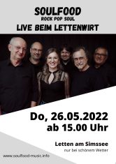 Am Donnerstag, 26. Mai (Vatertag / Christi Himmelfahrt) spielt ab 15.00 Uhr Soulfood beim Lettenwirt in Letten am Simssee (unterhalb von Hirnsberg). Soulfood ist Musik, die einfach Spass macht, für die sechs Musiker und das Publikum, zum Zuhören, Ratschen und Mitgrooven. In der Besetzung. 2 Gitarren, Bass, E-Piano/Keyboard, Schlagzeug und Sängerin coverd die Band alte und neue Rock-, Pop- und Soulnummern in ihrem eigenen Stil. Von Adele bis Santana und von Amy Winehouse bis Leonhard Cohan soll die Musik von Soulfood einfach unterhalten, einen entspannten Abend bieten oder auch mitreißen. Für eine gute Bewirtung sorgt die Lettenwirtin mit Getränken und Brotzeiten. Der Veranstaltung kann nur bei trockenem Wetter stattfinden.